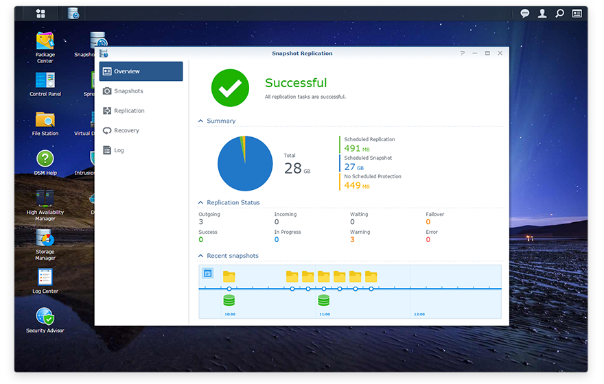 先進(jìn)的 Btrfs 文件系統(tǒng)于特定 NAS 機(jī)種上支持新的快照技術(shù)。Snapshot Replication 讓你可頻繁地將數(shù)據(jù)從主要備份地點(diǎn)復(fù)寫到異地存儲空間 - 最多可以每 5 分鐘備份共享文件夾,每 15 分鐘備份 LUN,確保你存儲在共享文件夾的重要機(jī)密或 iSCSI LUN 中的虛擬機(jī)能從災(zāi)難事件中快速地復(fù)原。